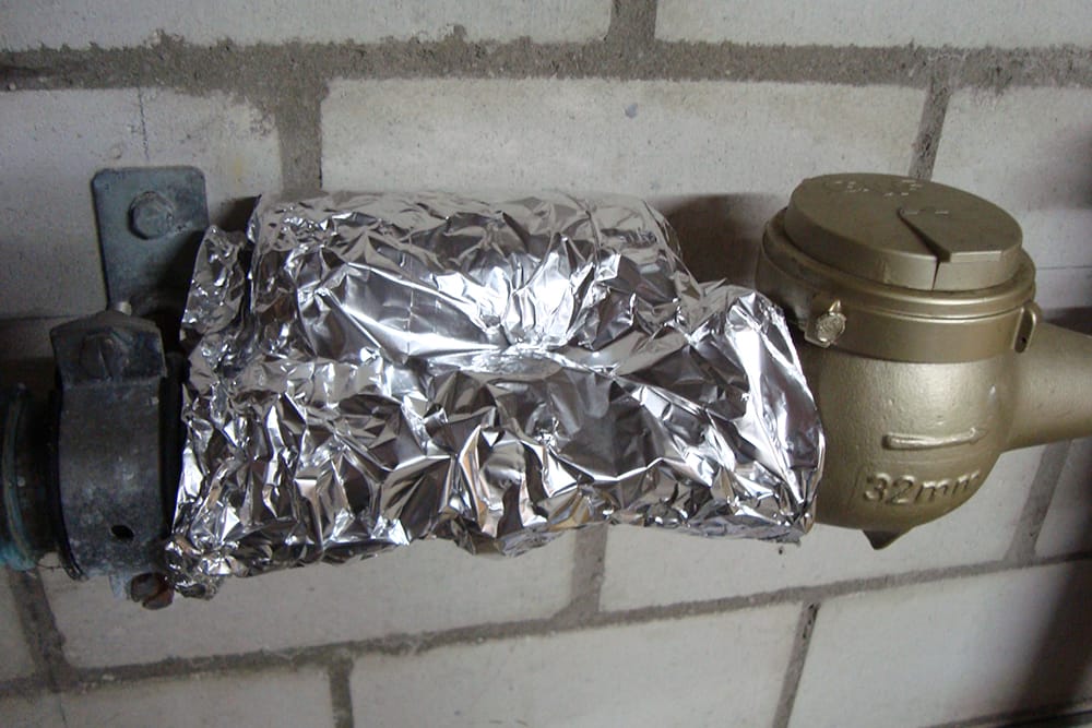 - Damit der Kalkumwandler nicht von Elektro-Geräten abgeladen werden kann, schützen wir ihn (Rohr mit Kalkumwandler/Bauch an Bauch, mit Kabelbinder befestigen) mit drei Lagen Aluminiumfolie mit der Glanzseite gegen aussen (wie ein Bonbon eingepackt).
